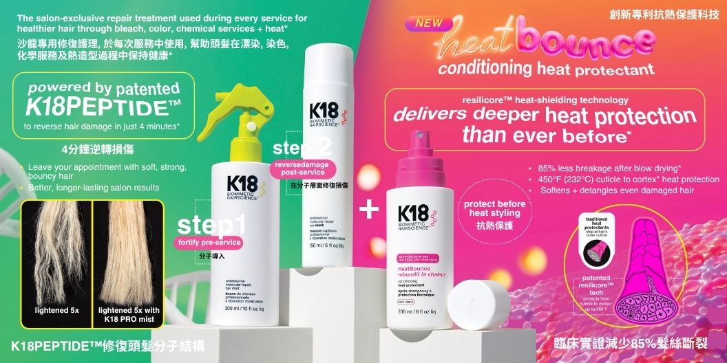 K18 是市場首個能重新連接斷裂的角蛋白鏈的生物科技產品,兼容所有專業髮廊服務,只需4分鐘,補充頭髮最深層的膠原角蛋白以快速強化頭髮結構。你便可以提升你的服務質素,令客人的頭髮維持健康狀態。